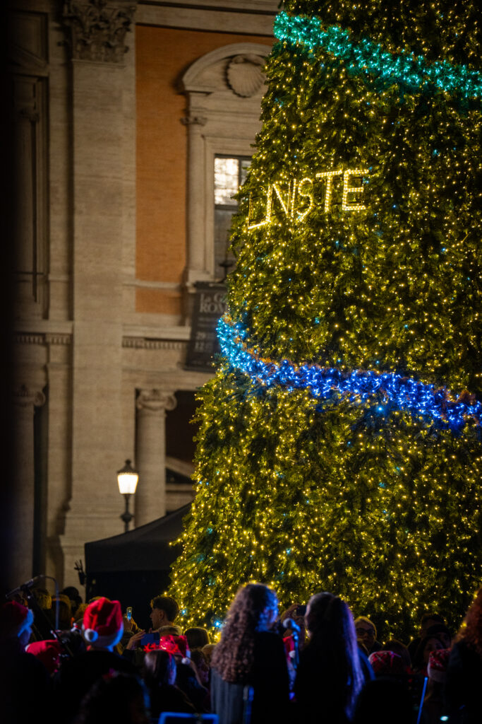 È stato acceso martedì 9 dicembre, su iniziativa della presidenza dell’Assemblea capitolina che quest’anno ha voluto dedicare il classico abete natalizio, rigorosamente sintetico, alla pace: oltre alle luci, ai nastri a led e al puntale, la parola “Pace”, tradotta in diverse lingue, viene illuminata di bianco.